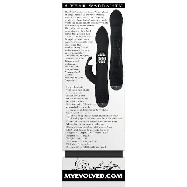 This big, boisterous bunny's got plenty of magic tricks! A bulbous twirling head spins deliciously in 10-speed tandem with mid-shaft rotating beads, while the entire length thrums with its own multi-speed vibration! The rabbit...