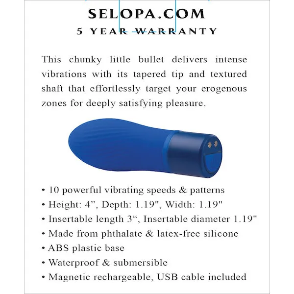 This chunky little bullet delivers intense vibrations with its tapered tip and textured shaft that effortlessly target your erogenous zones for deeply satisfying pleasure. Five Year Warranty.